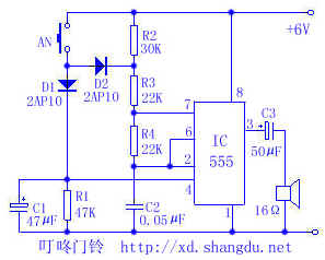 图中的IC便是时基电路集成块555,它构成无稳态多谐振荡器。按下按钮AN(装在门上),振荡器振荡,振荡频率约700Hz,扬声器发出“叮”的声音。与此同时,电源通过二极管D1给C1充电。放开按钮时,C1便通过电阻R1放电,维持振荡。但由于AN的断开,电阻R2被串入电路,使振荡频率有所改变,大约为500Hz左右,扬声器发出“咚”的声音。直到C1上电压放到不能维持555振荡为止。“咚”声的余音的长短可通过改变C1的数值来改变。
